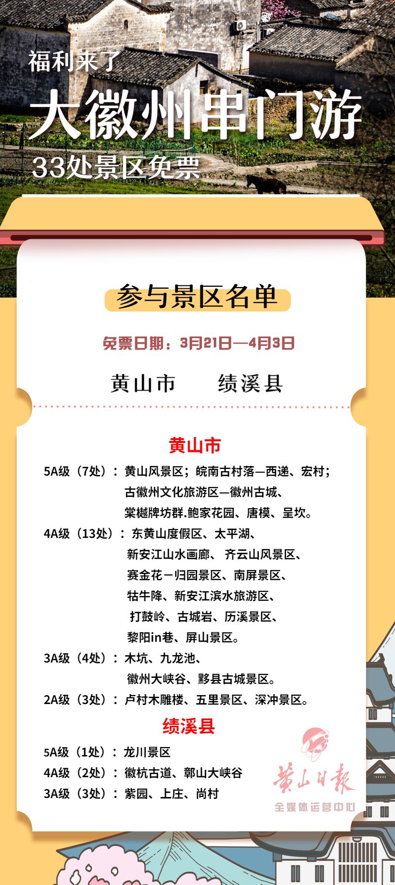 2019年12月底,文化和旅游部將徽州文化生態保護區等正式公布為國家級文化生態保護區。記者從黃山市文旅局獲悉,為不斷深化對非物質文化遺產區域性整體保護的認識,增進人文互動交流,黃山市與宣城市績溪縣率先進行區域聯合,于3月21日至4月3日共同舉辦“大徽州 串門游”主題活動。黃山市三區四縣和宣城市績溪縣市民憑本人有效證件(身份證、戶口簿或居住證),可享受黃山市和績溪縣A級旅游景區門票免費優惠政策,目前共有33處已恢復開放的景區點積極響應。